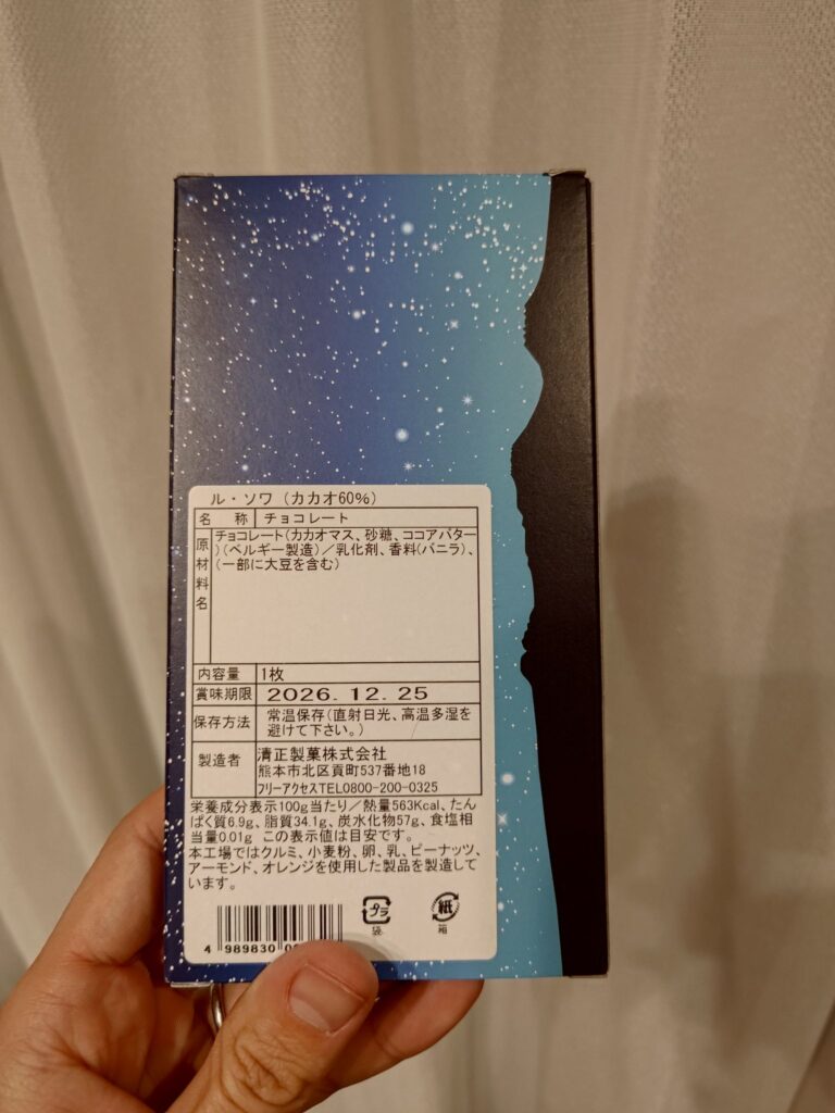 内容量は1枚で、栄養成分表示を見ると100g当たり熱量563Kcal。まあチョコレートなのでカロリーは気にせず楽しみましょう(笑)