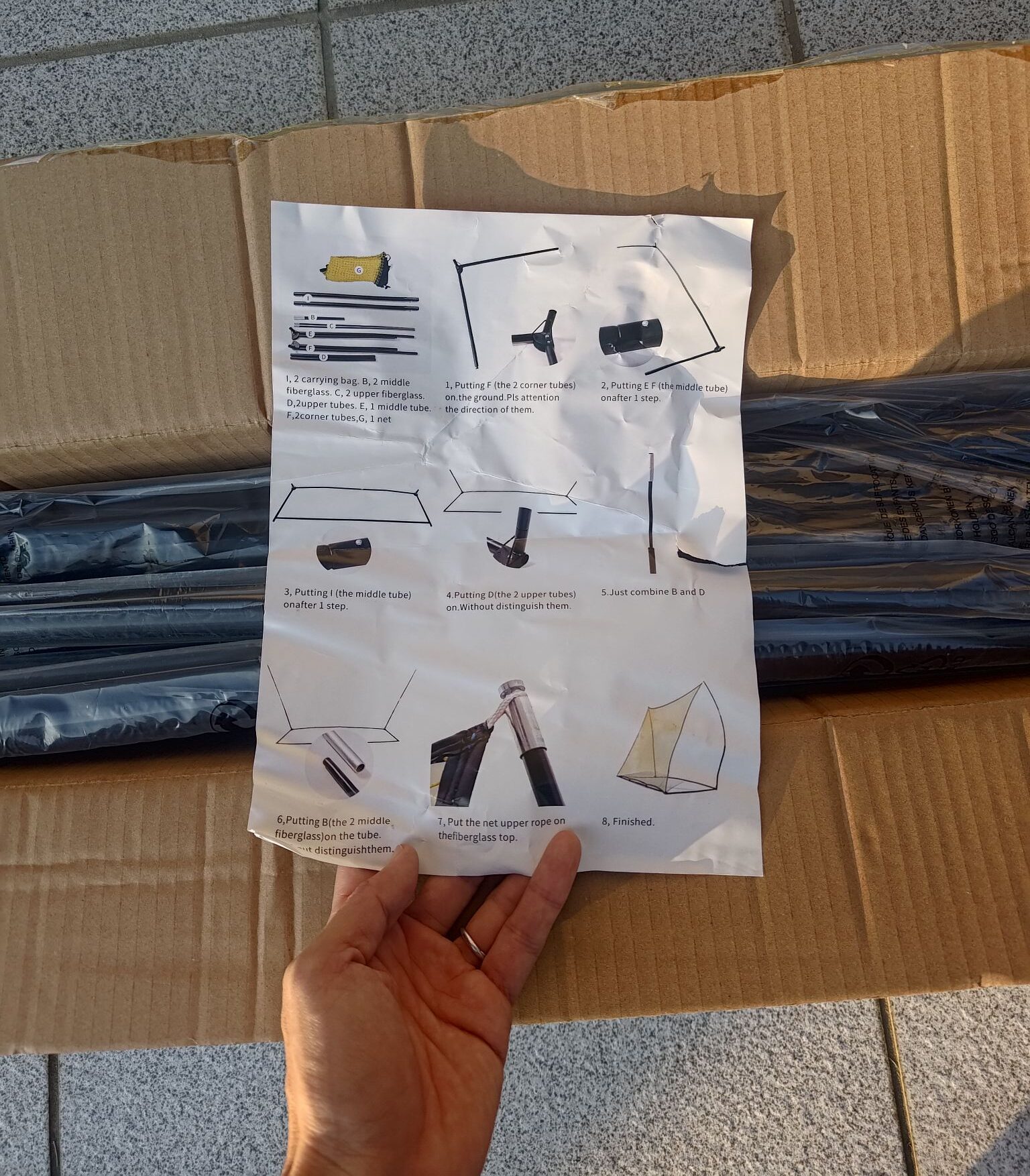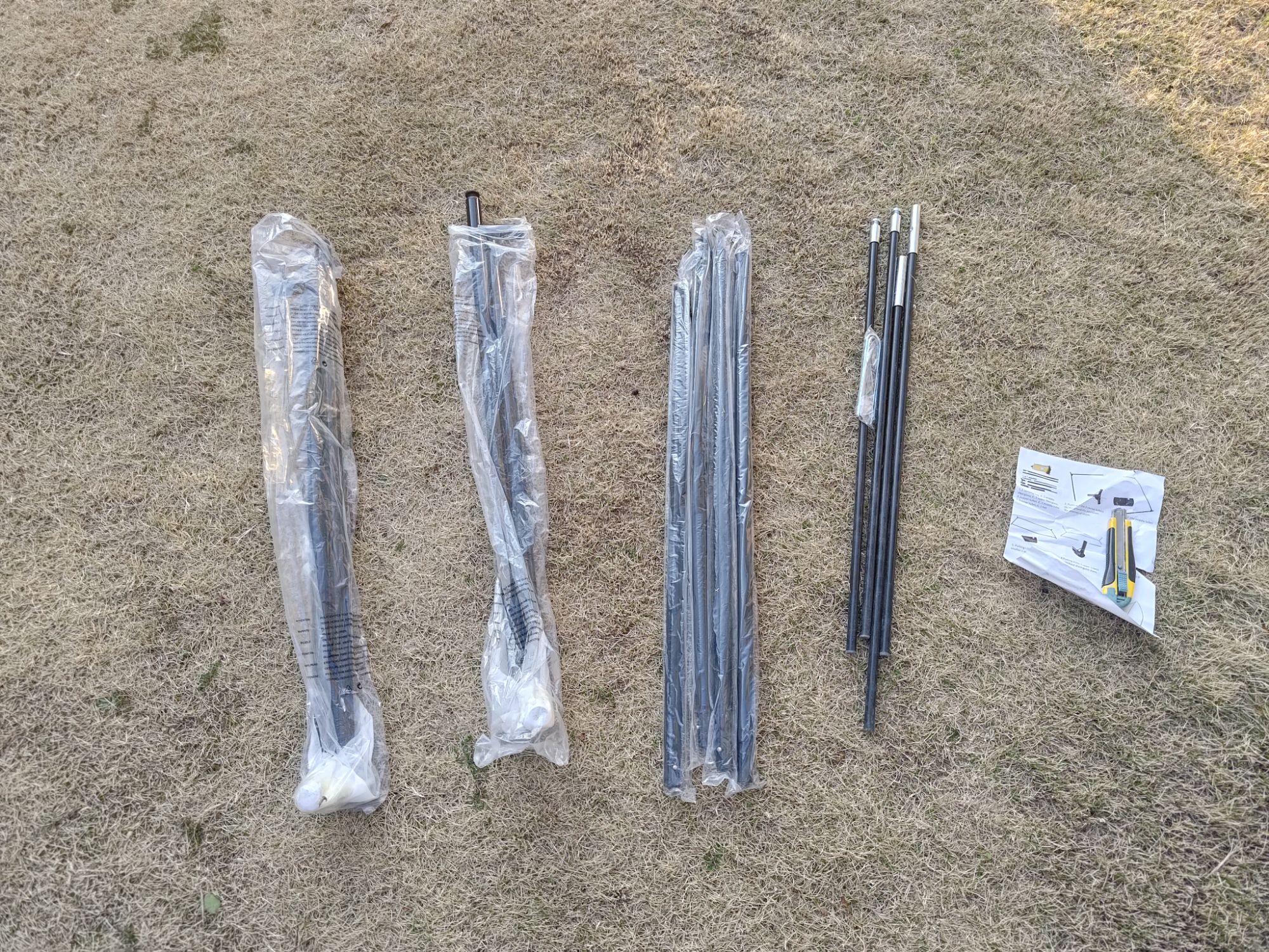 - パーツを確認:フレーム、コーナーチューブ、ネット、収納バッグ