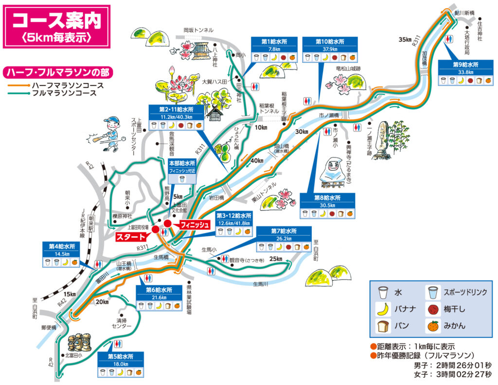 紀州口熊野マラソンのコースは、前半はあちこちに走りますが後半は富田川に沿って走るコース。
