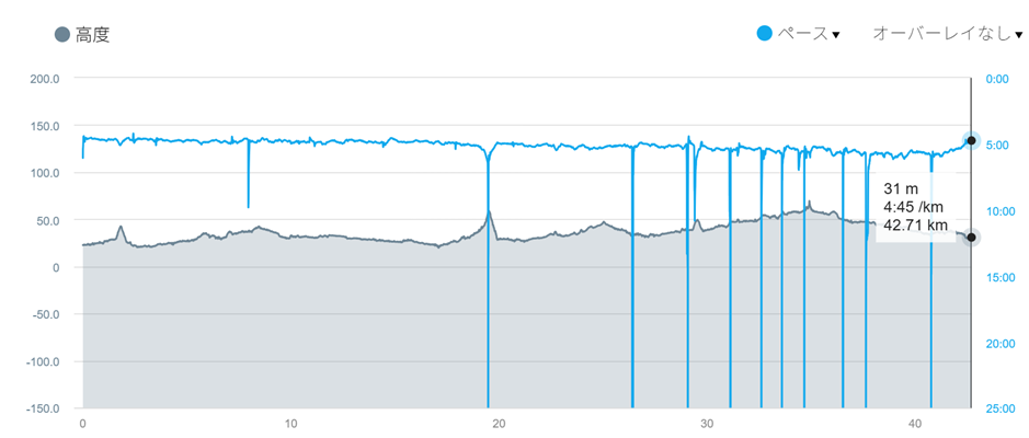でもペースグラフを見ると、前半は比較的安定して走れています。